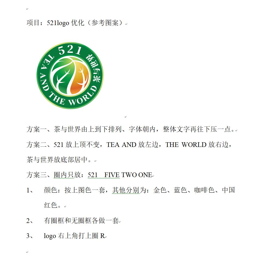 - 一、注冊商標(biāo):521,logo設(shè)計(jì)的創(chuàng)意和要求 1、logo作品原創(chuàng) 2、以521TEA AND THE WORND茶與世界 2、521FIVE TWO ONE作為創(chuàng)意logo圖案; 3、logo設(shè)計(jì)元素象征世界茶產(chǎn)業(yè)團(tuán)結(jié)、和諧、發(fā)展; 4、logo數(shù)字、英文、中文組合圖案形式設(shè)計(jì)、作品能通過國家商標(biāo)局審核注冊。 5、logo設(shè)計(jì)簡潔大氣,既有521數(shù)字識別特征、圖案又有5.21世界國際茶日為中心思想的元素,521logo代表世界茶產(chǎn)業(yè)(世界節(jié)日) 6、參考附件圖案